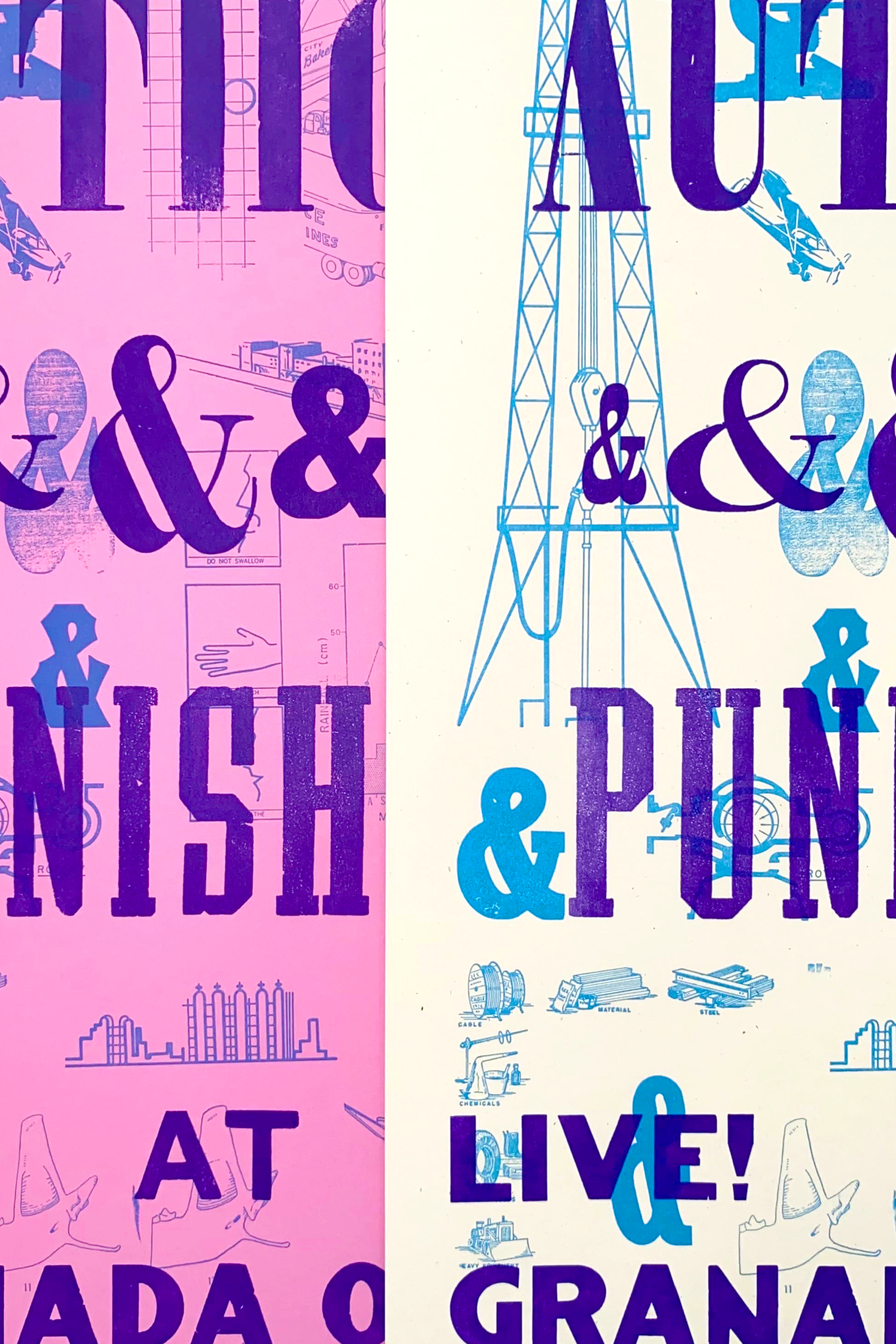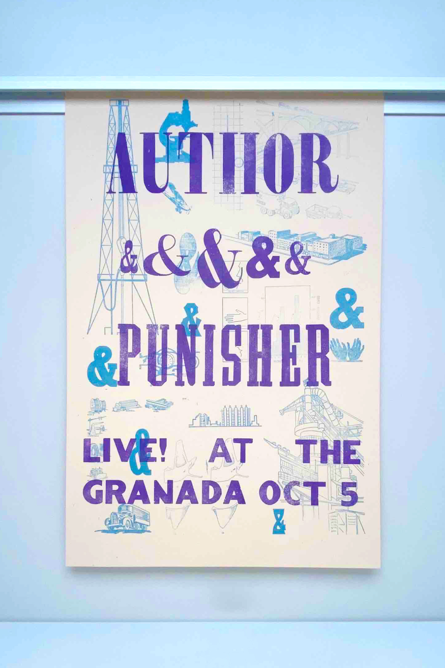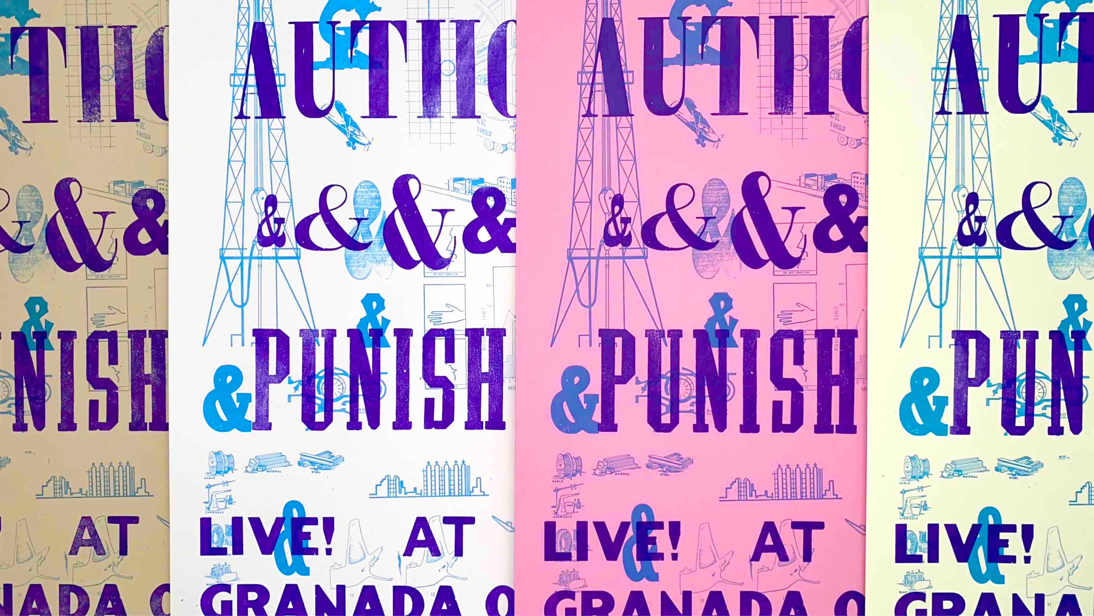 Using hand-mixed ink, wooden type, and existing imagery in the KU letterpress lab, these posters reference Author & Punisher’s industrial and mechanical sound.