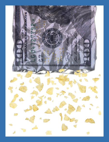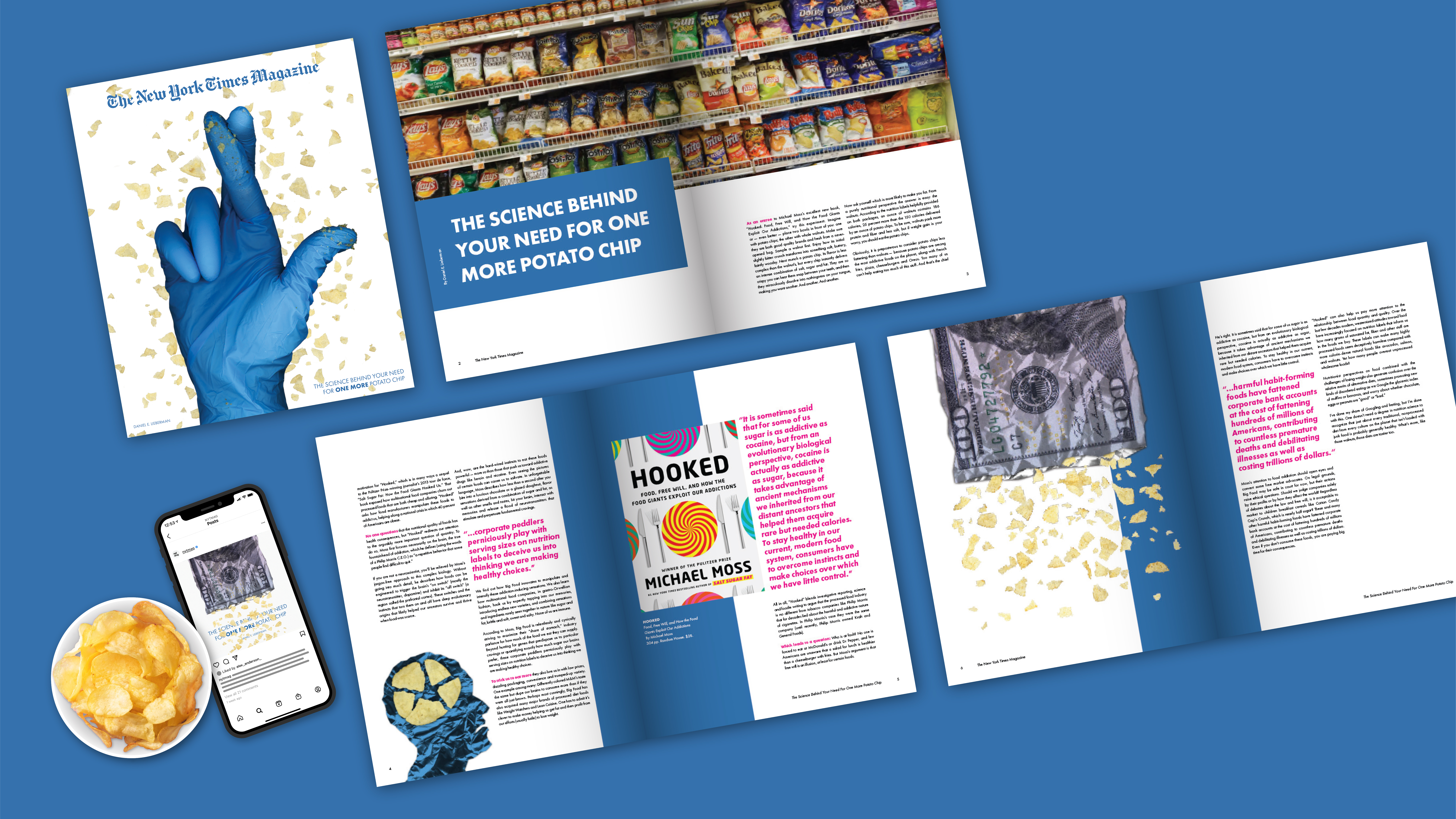 Using multimedia design, this magazine cover and spot art hint at the revelation of the snack food industry’s sinister underbelly hidden behind the article’s innocuous title.
